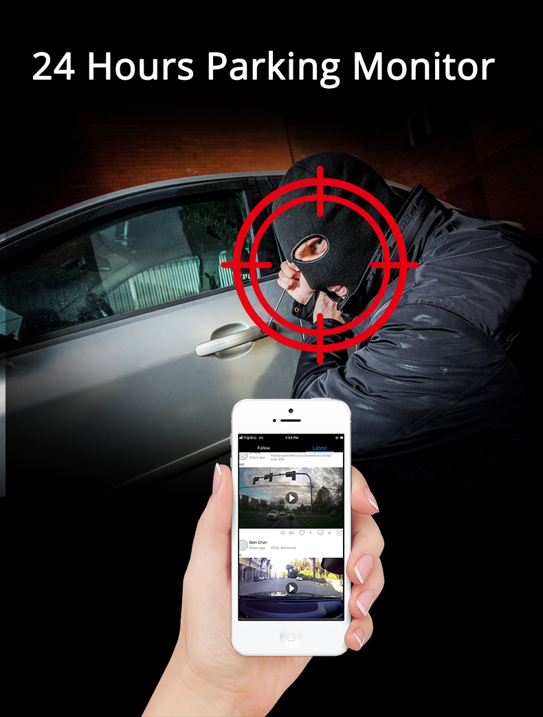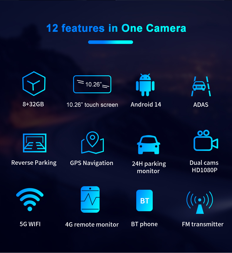 | Jellemzők | 4G Élő közvetítés (távoli megtekintés) Hotspot funkció (az eszköz Wi-Fi hotspotként) FM Adó (88-108MHz) CarPlay (iPhone) Auto (Android) Ütközési videó zárolása (ciklikus felvétel) Parkolás felügyelet Reset funkció |