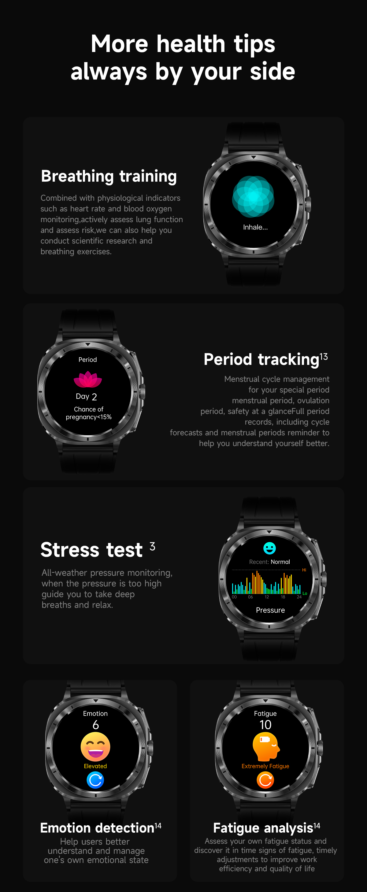 | Egészség monitorozás | Alvás monitorozás Vérnyomás mérés Pulzus Vér oxigén szint Menstruációs ciklus monitorozás Fáradtság monitorozás Érzelmek monitorozás Vércukor mérés Húgysav és lipidek mérés Zsír BMI mérés |