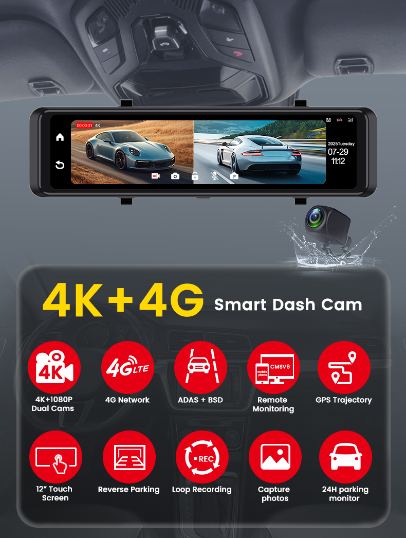 iSEN V7 Visszapillantó Tükör Fedélzeti Kamera, 11.26" Érintőkijelző, 4K 25fps Előlapi & 1K Hátlapi, 4G Távoli Elérés, GPS+Beidou, G-szenzor, ADAS, BSD, Időzített Felvétel, Parkolásfigyelés