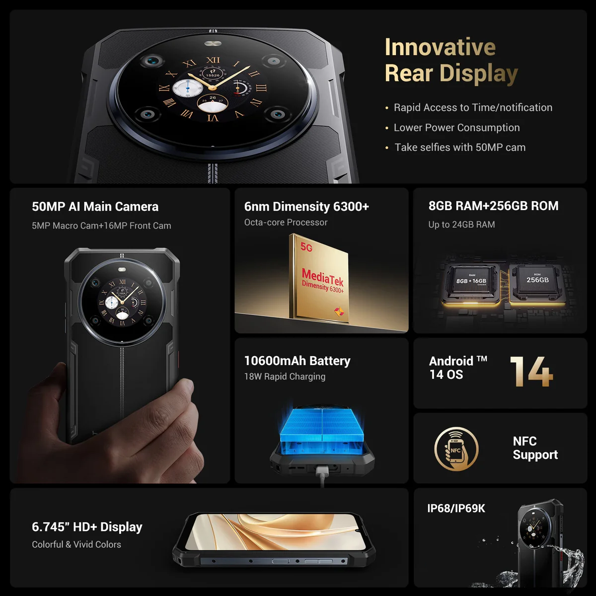 Fossibot Mobiltelefon FOSSiBOT F109 5G, Kettős Kijelző, 6.745” HD+ IPS 1.32", 24GB RAM (8GB + 16GB bővíthető), 256GB ROM, Android 14, MediaTek Dimensity 6300+ Nyolcmagos, Dual SIM
