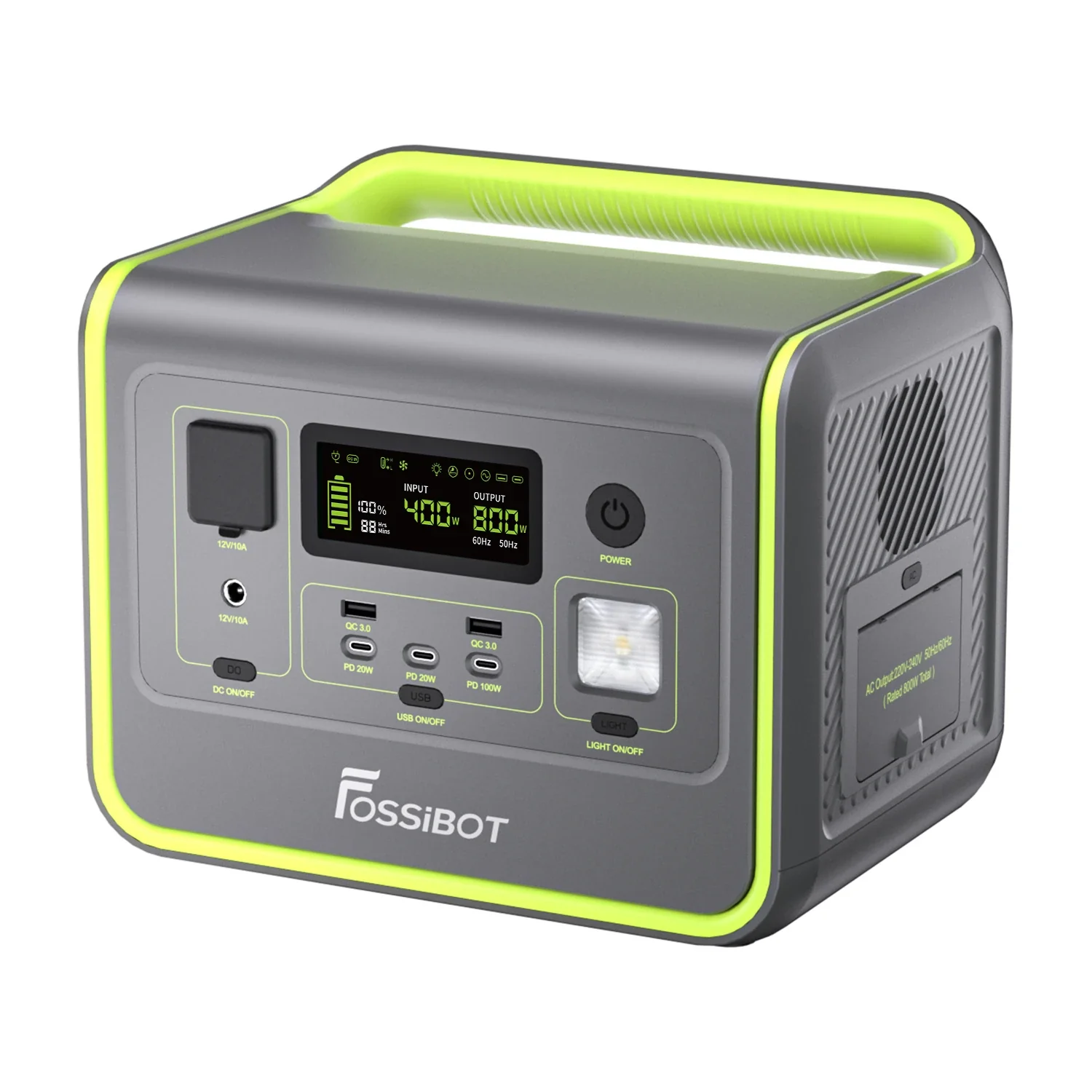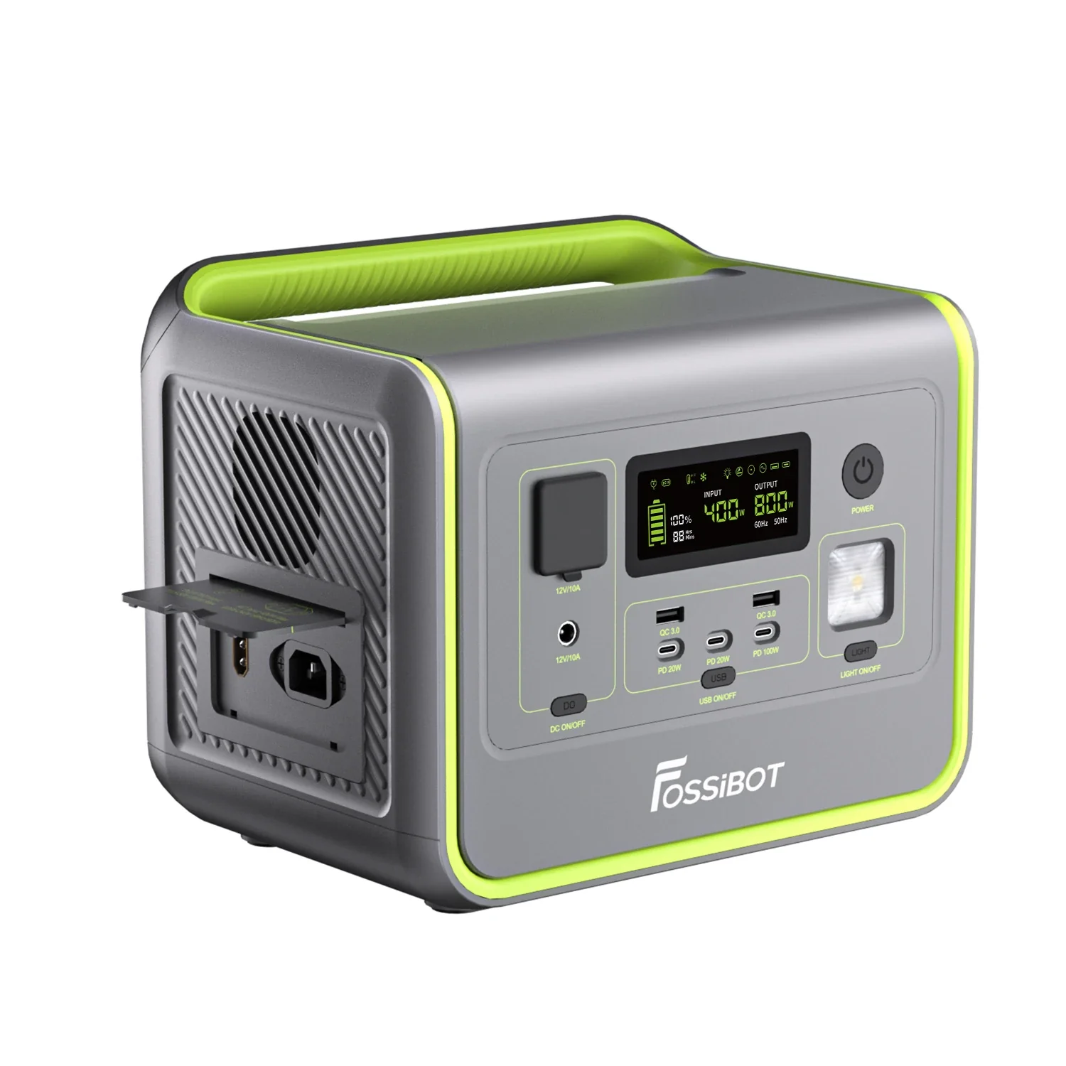 Statie de incarcare portabila Fossibot F800 Verde, 800W, 512Wh, Ecran LCD, Protectie BMS, 8 iesiri, Lanterna LED, SOS