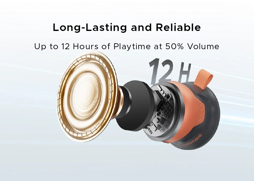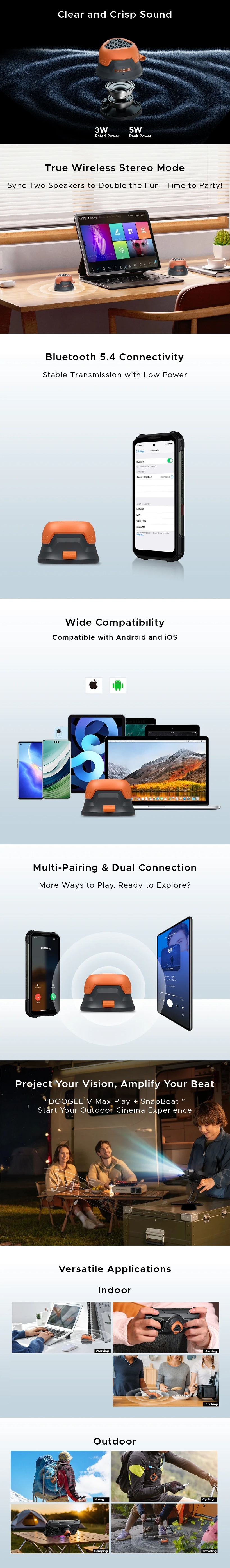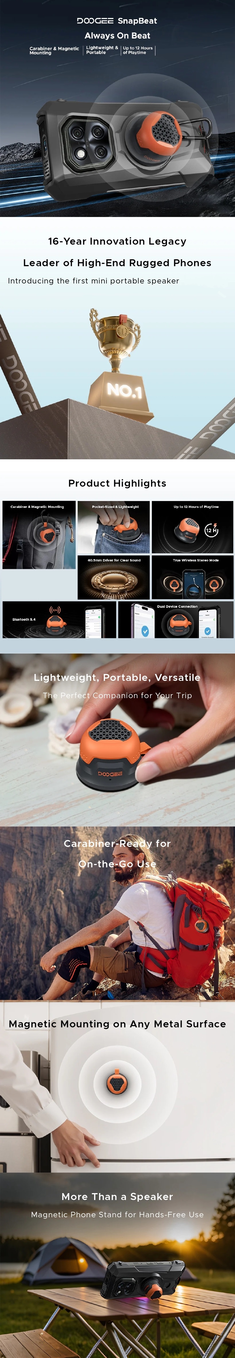 Hordozható hangszóró DOOGEE SnapBeat, Fekete, Többszörös párosítás, Android & iOS, 5W csúcsteljesítmény, Bluetooth v5.4, Akár 12 óra lejátszási idő, Karabineres és mágneses rögzítés, IP66