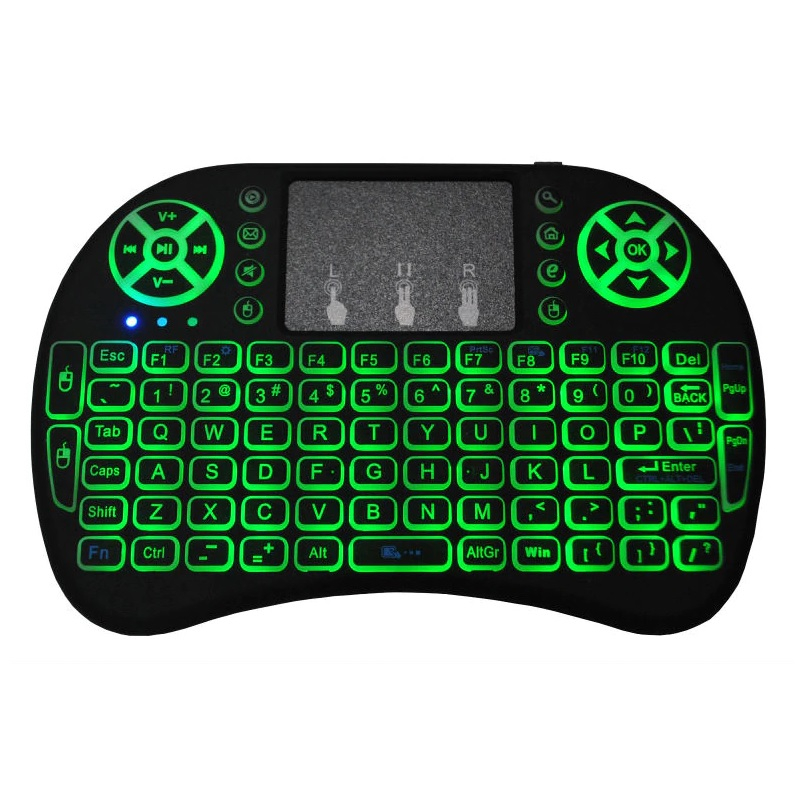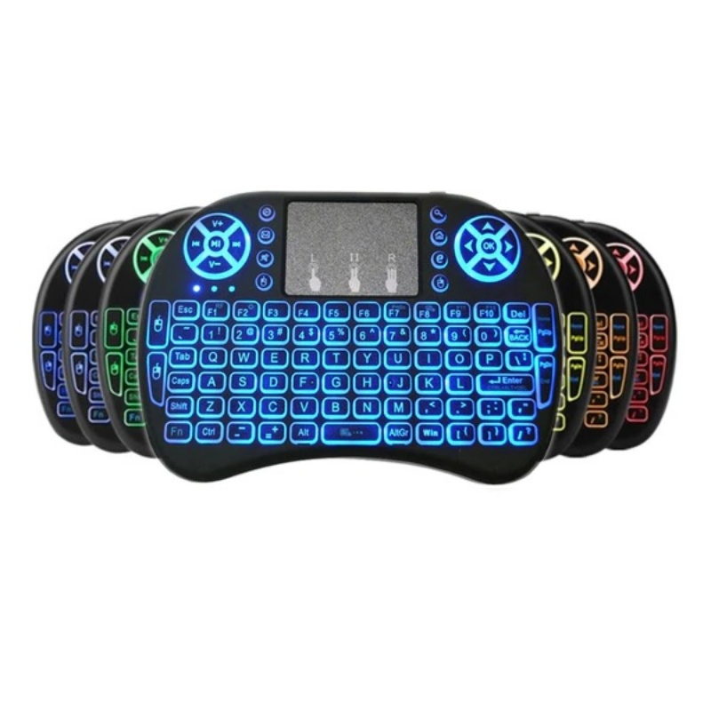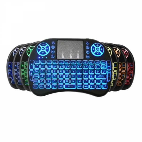 Telecomanda wireless QWERTY cu mini tastatura STAR i8, 2.4G, Iluminare LED 7 culori, Air mouse, Touch pad, Negru