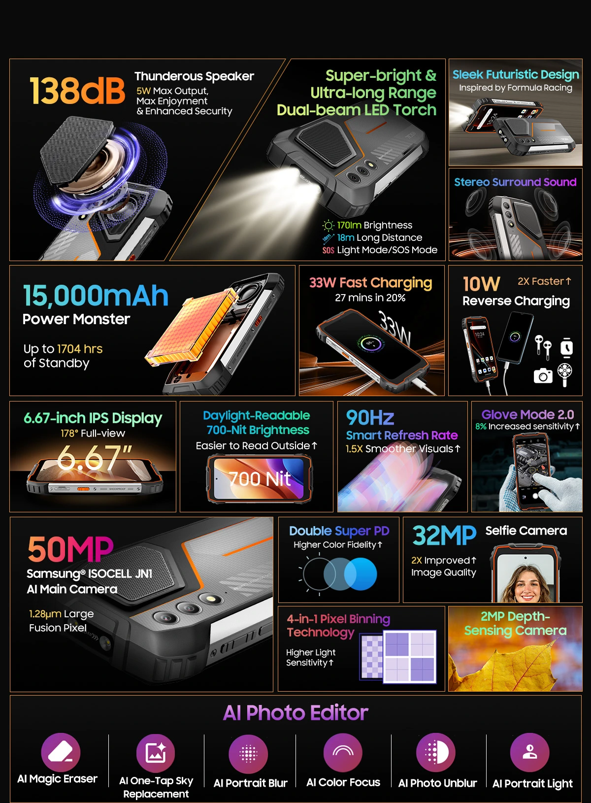 | Egyéb | Kettős LED-es zseblámpa 170 lumen Smart-K hangszóró ArcSoft OTG LED jelző Kesztyű mód Arcfeltöltő fény |