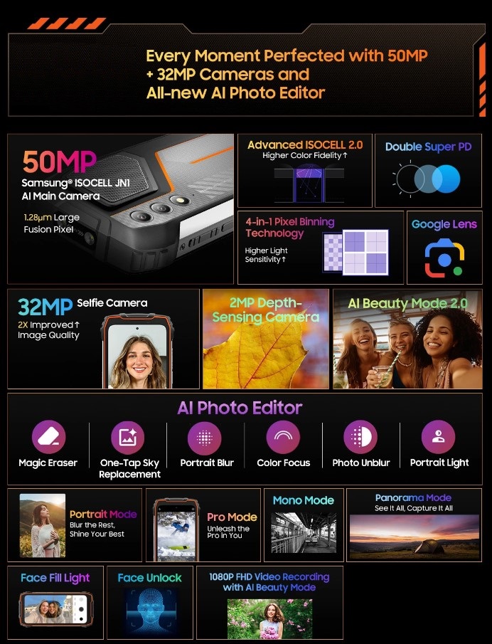 | Fényképezőgép | Fő: 50 MP (Samsung ISOCELL JN1) 2MP (mélységérzékelő kamera) Másodlagos: 32 MP |