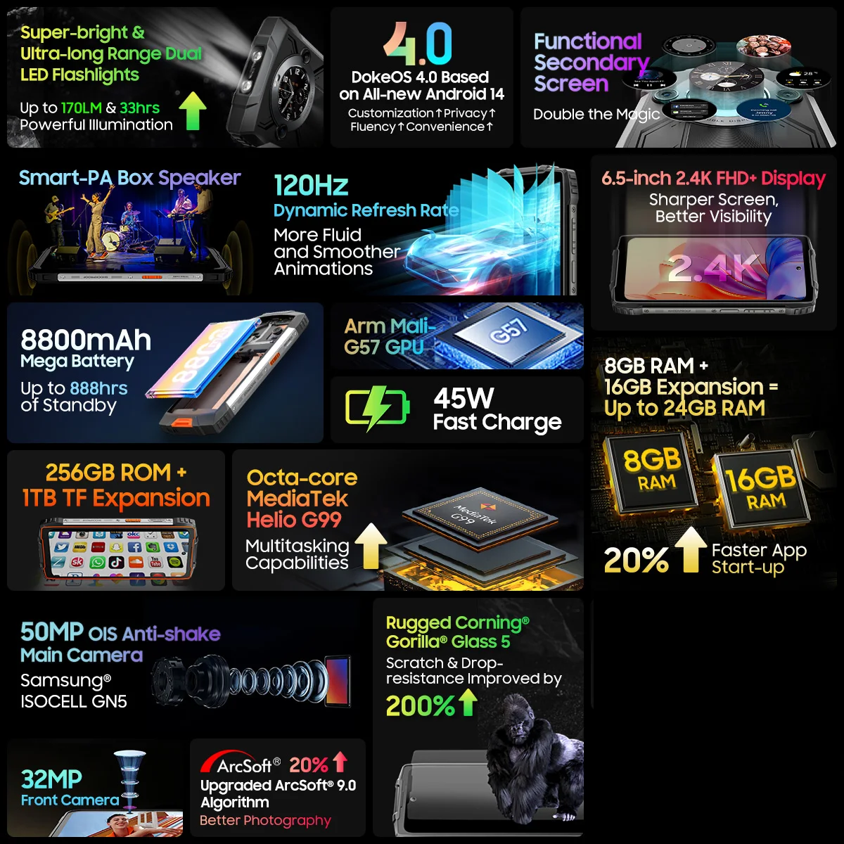 Fedezze fel az OSCAL PILOT 2 mobiltelefont. 6,5 hüvelykes 2,4K FHD+ kijelzővel, 24 GB RAM-mal (8 GB + 16 GB) és 256 GB ROM-mal rendelkezik, bőséges teljesítményt és tárolókapacitást biztosítva. Élvezze a Dual 4G VoLTE technológiát és egy erős, 8880mAh-s akkumulátort. Ráadásul IP68 & IP69K minősítéssel rendelkezik a tartósság érdekében
