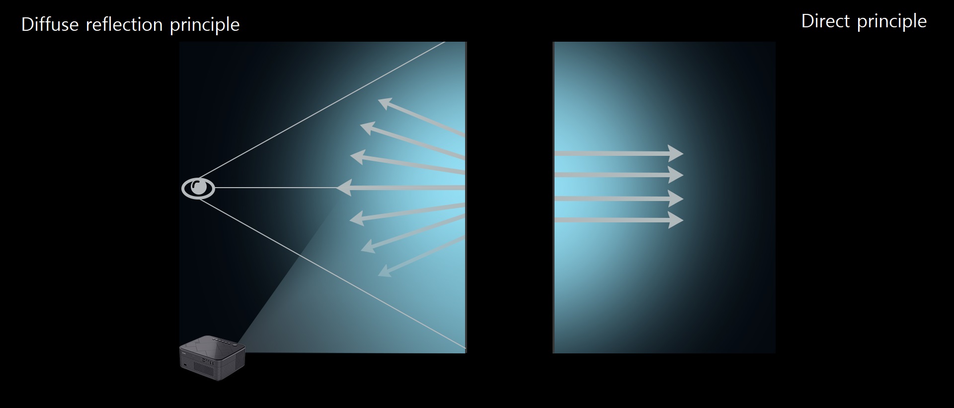 The light source is projected on a white wall or screen, and the reflection is diffused into the eye,