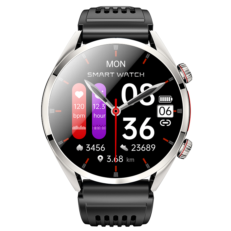 iSEN FE02 Okosora, Ezüst, Fekete Szilikon Szij, 1.43" AMOLED, EKG, Pulzus, SpO2, Verglukoz, Vernyomas, Sport Modok, HD Bluetooth Hivas, 350 mAh, Android 5.0 vagy iOS 10.0 vagy ujabb