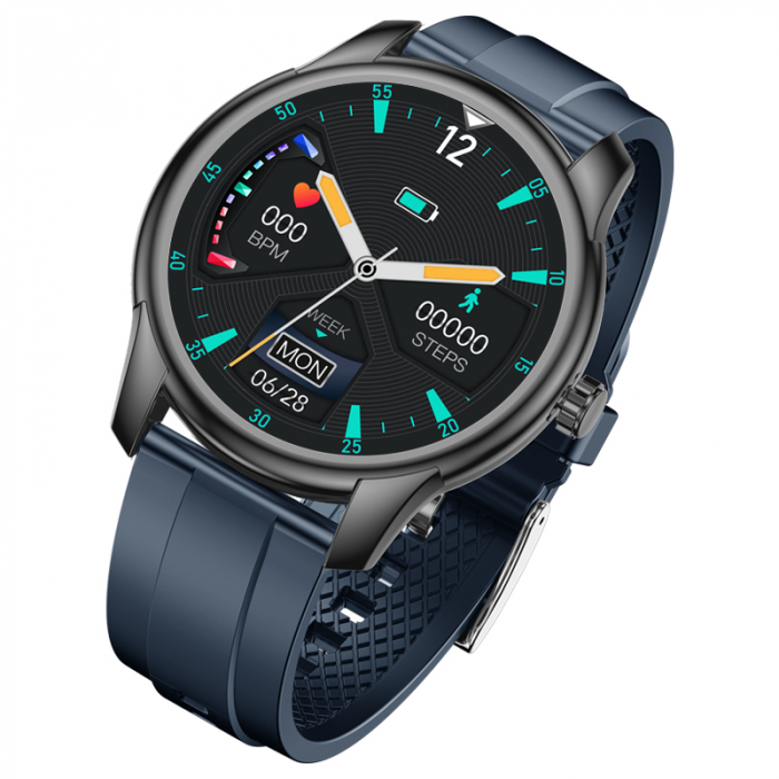 Okosóra iSEN W9 Watch Fekete sötétkék TPU karkötővel, 1,3" testreszabható kijelző, IP68, 200mAh, HR, feszültség, értesítések, zene