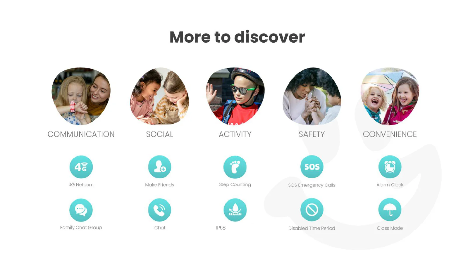 A smart and robust watch, perfect for children's safety (5-14 years), featuring precise location and health monitoring.
