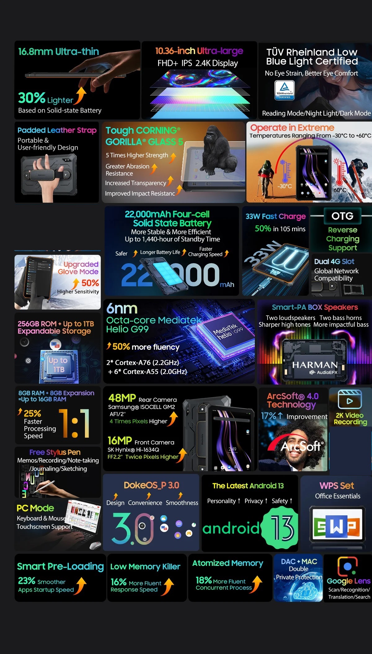 | 1x Blackview Active 8 Pro Tablet 1x töltő 33W 1x USB Type C kábel 1x Stylus 1x USB Type C adapter 1x tartószalag 1x Felhasználói kézikönyv |