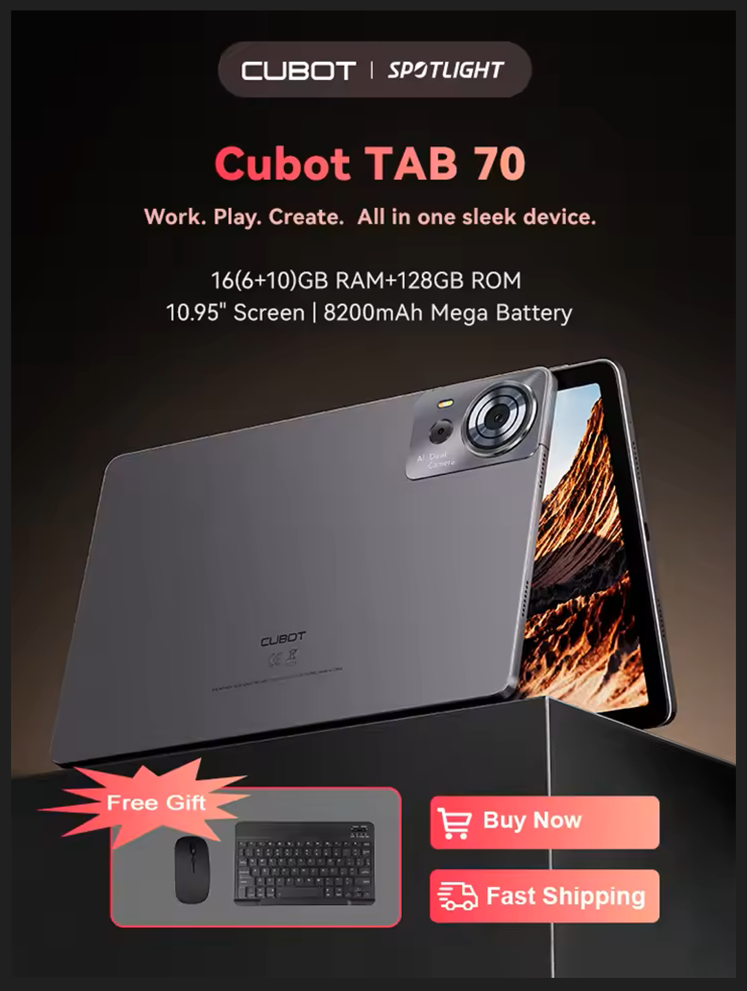 | 1x Cubot Tab 70 1x töltő (5V 2A) 1x USB kábel 1x Felhasználói kézikönyv 1x védőtok 1x anya 1x billentyűzet 1x egér |