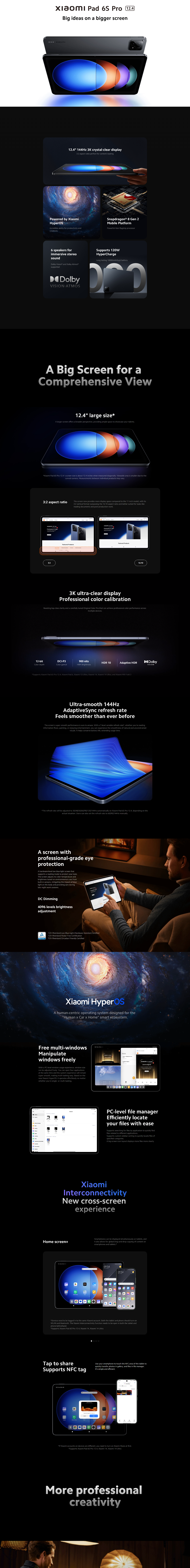 Xiaomi Tableta Xiaomi Pad 6S Pro, LCD 12.4" 3K 144Hz, 12GB RAM, 512GB ROM, Xiaomi HyperOS, Android U, 50MP+ 32MP, Snapdragon® 8 Gen 2, WiFi 7, 10000mAh, 120W