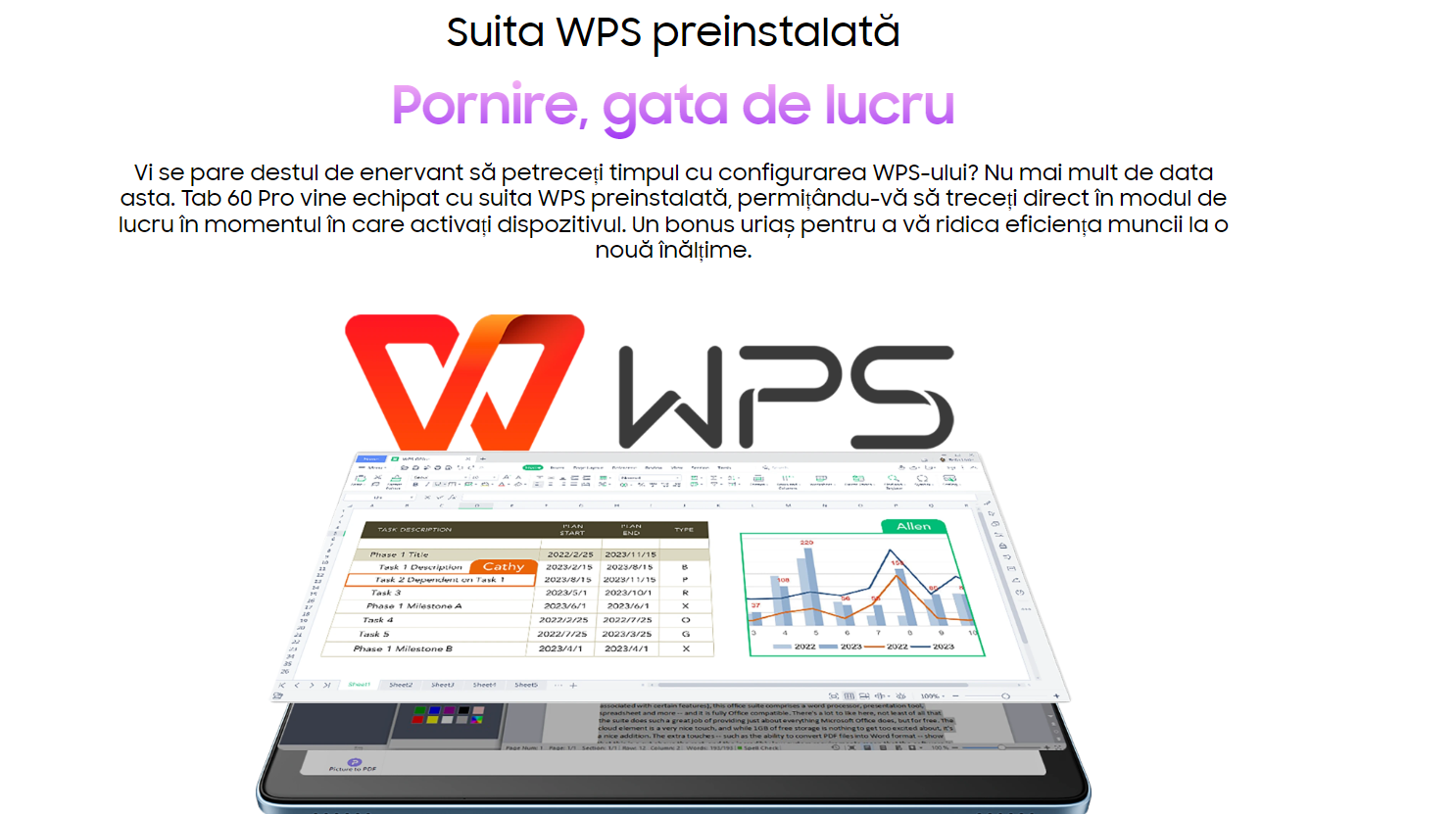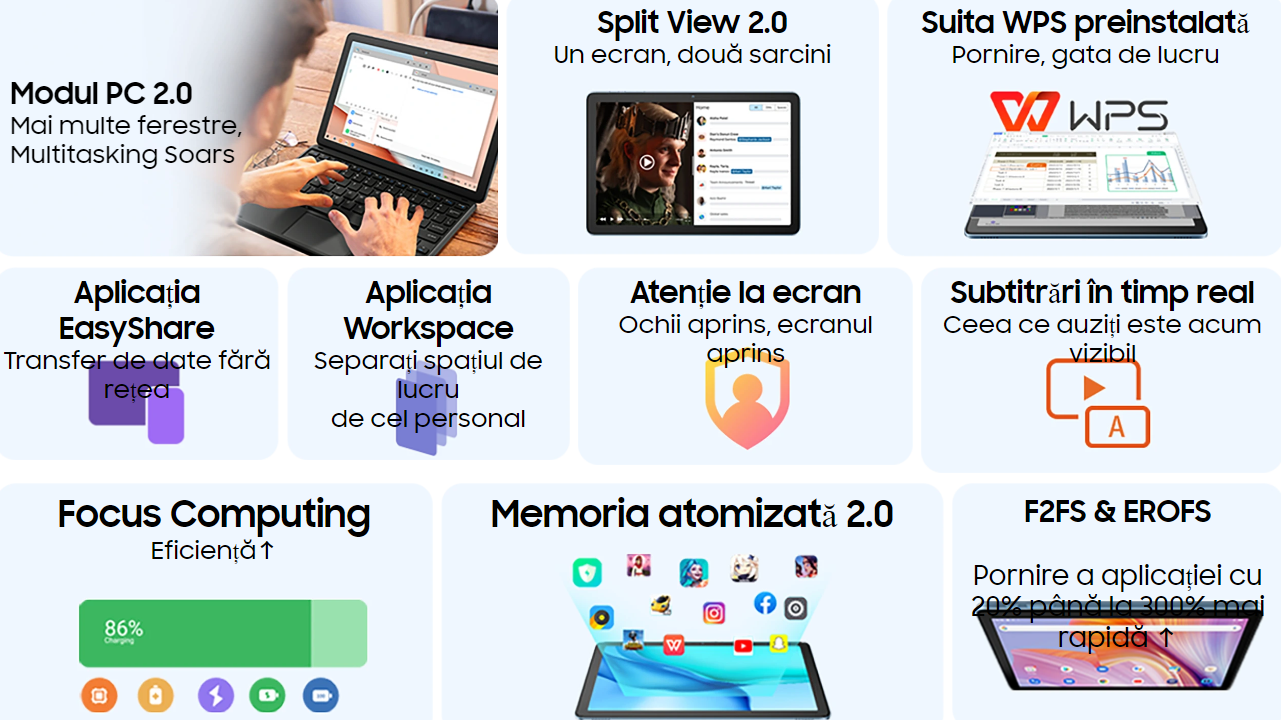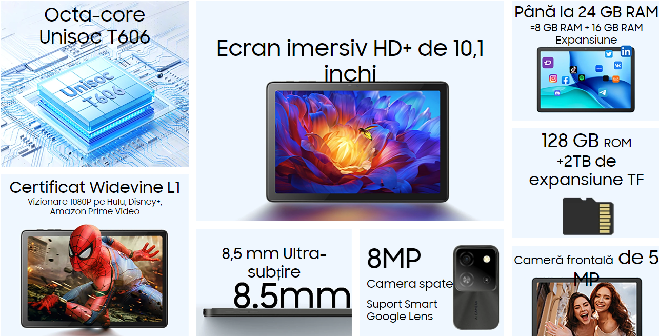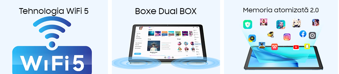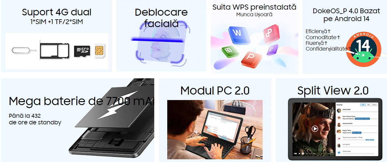 Continut pachet: Tableta, Incarcator, Cablu USB, Cheita SIM, Manual de utilizare
