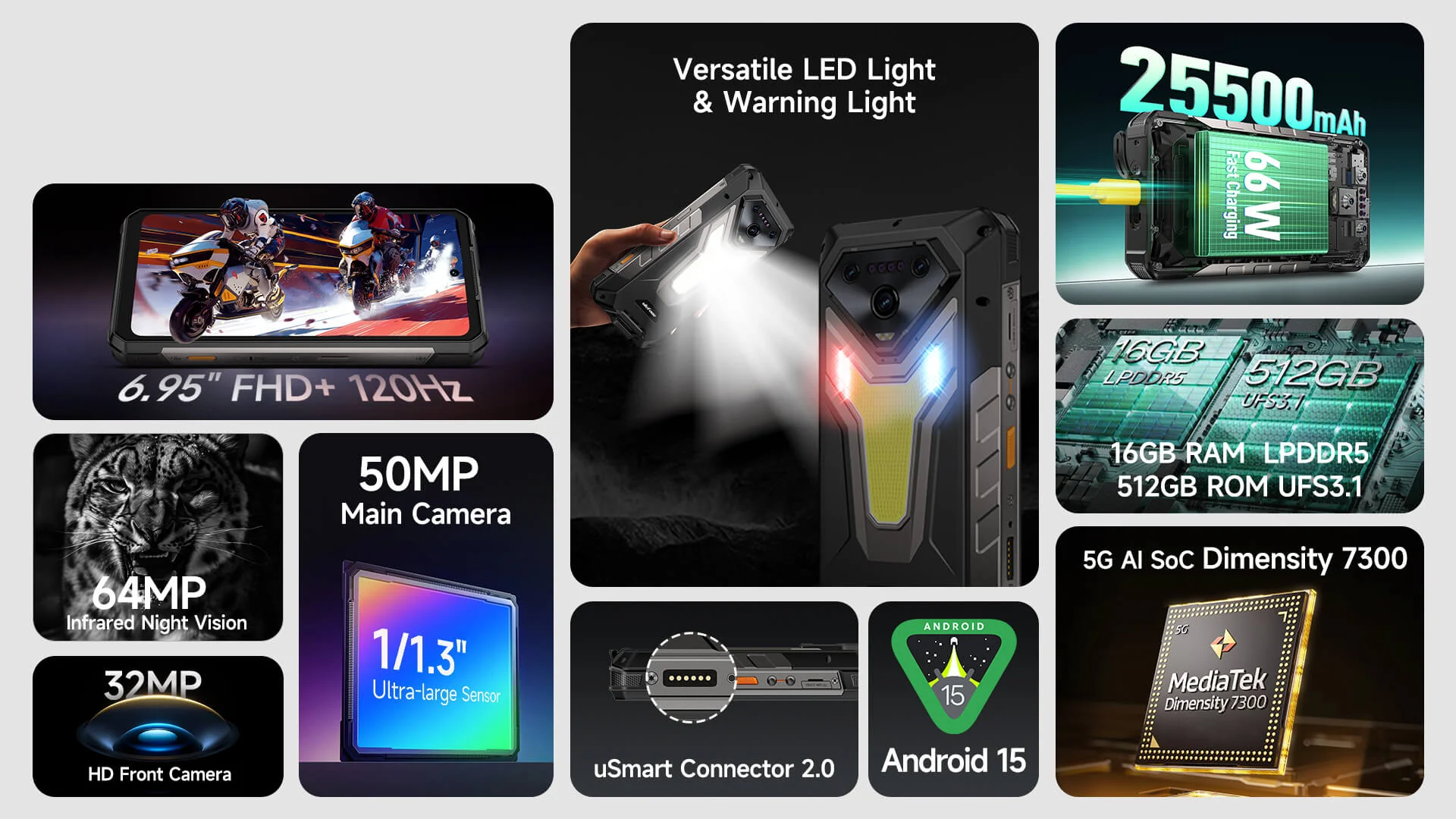 Az ULEFONE ARMOR 34 Pulse Black színben egy rendkívül masszív energiatárolóval, 25,500 mAh akkumulátorral, nagy 6.95‑inch FHD+ 120 Hz kijelzővel és fejlett kamerákkal rendelkezik: 50 MP főkamera, 64 MP éjszakai látás, 50 MP ultra‑széles. Android 15 fut Dimensity 7300 5G chipen, 16 + 16 GB RAM-mal és 66 W gyors töltéssel. Tartalmaz sokfunkciós LED lámpát.
