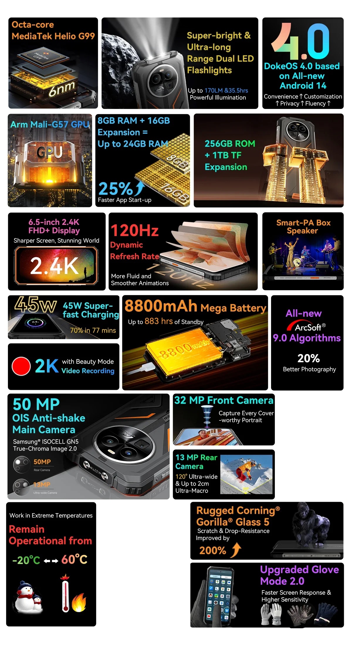 Mobiltelefon Blackview BV8100, 4G, 6.5" 2.4K FHD+, 24GB RAM (8GB + 16GB bővíthető), 256GB ROM, Android 14, MediaTek Helio G99, 50MP + 32MP, 8800mAh, 45W, NFC, Dual SIM, Fekete