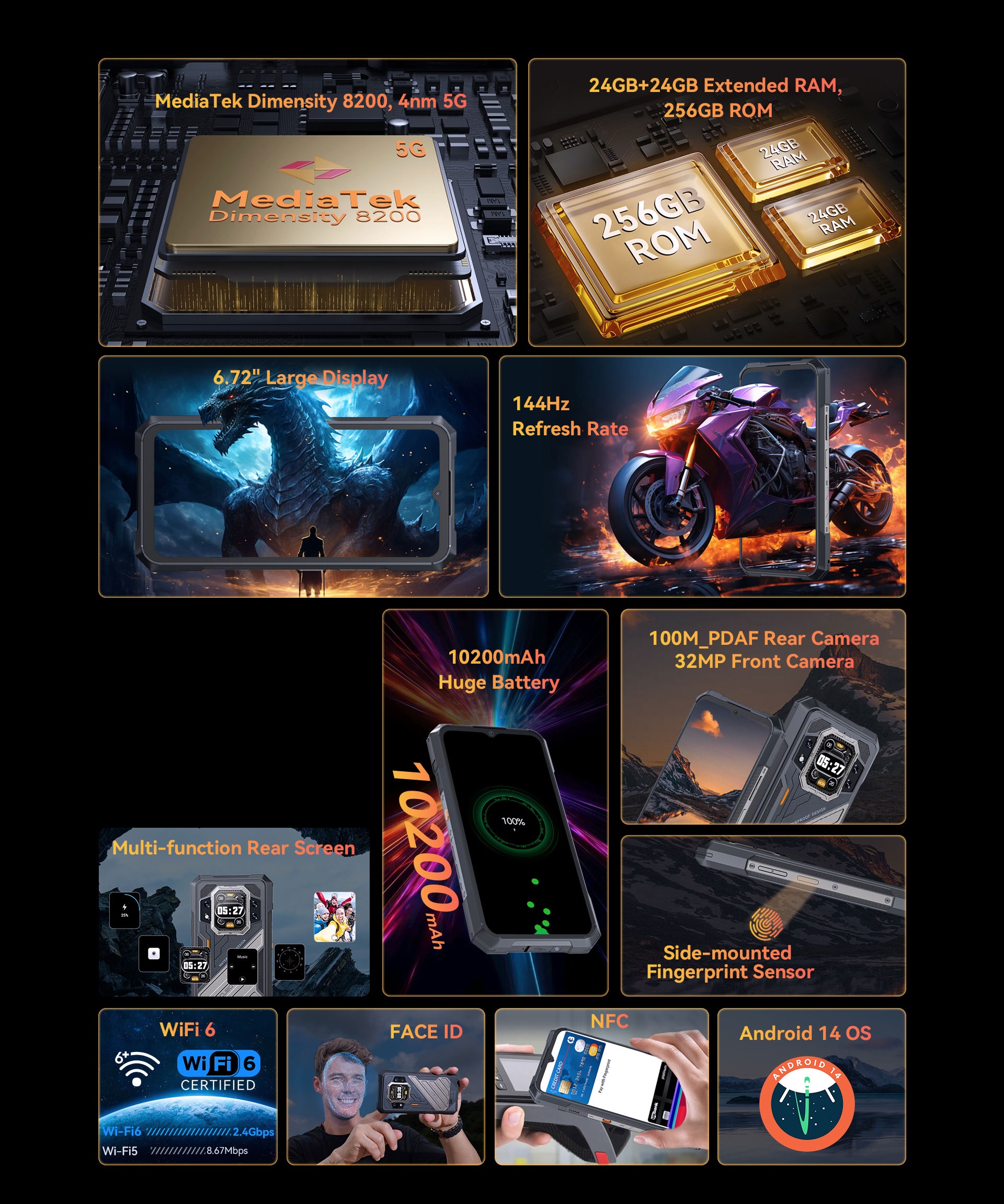 Mobiletelefon Cubot KingKong X Pro, Fekete, 5G, 6.72" FHD+ 144Hz Kettős Képernyő, 24GB RAM (12GB + 12GB bővíthető), 256GB ROM, Android 14, MediaTek Dimensity 8200, 100MP + 32MP, NFC, 10200mAh Dual SIM