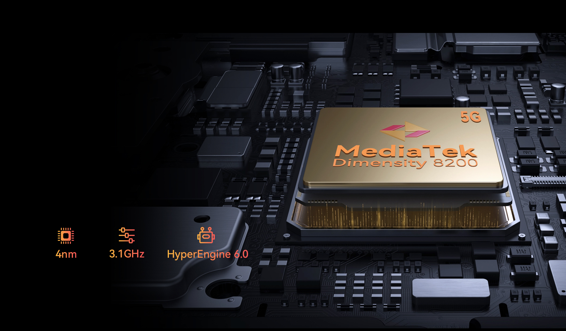 | CPU | MediaTek Dimensity 8200, Octa-core, 4nm 4x A78 (1x 3.1GHz + 3x 3.0GHz) + 4x A55 2.0GHz |