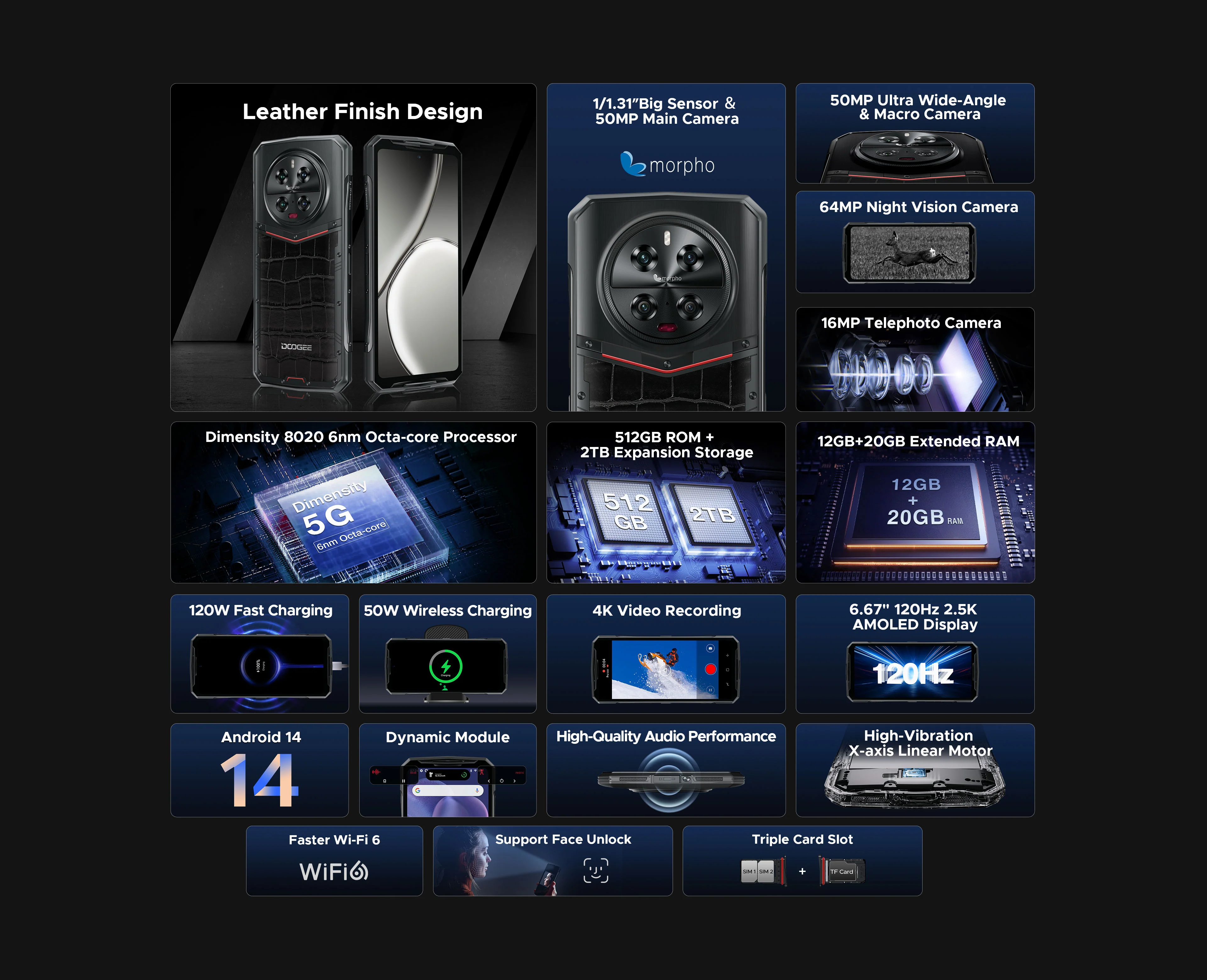 Mobiltelefon Doogee DK10, Fekete Bőr, 5G, 6,67" 120Hz 2K AMOLED, 32GB RAM (12GB + 20GB bővíthető), 512GB ROM, Android 13, Dimensity 8020, Morpho® Quad Camera, NFC, OTG, FM, 5150mAh, 120W, Dual SIM