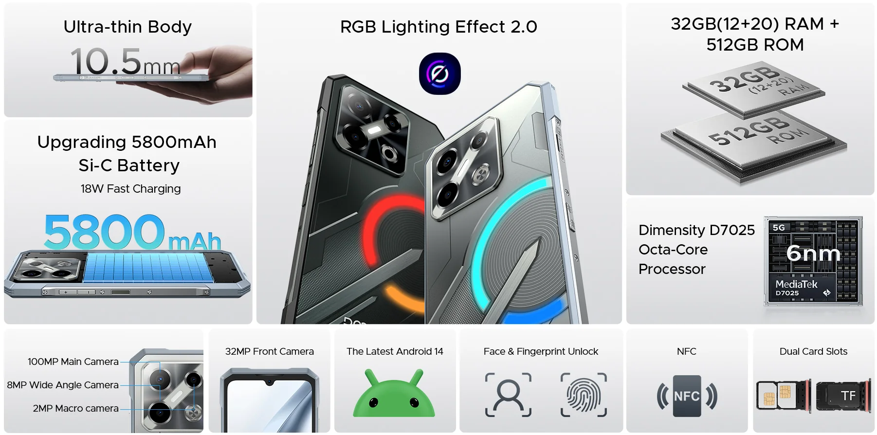 Doogee Mobiltelefon Doogee Blade GT Pro, Fekete, 5G, 6.72" FHD+ IPS LCD 120Hz kijelző, 100MP AI kamera, 32GB RAM (12GB + 20GB bővíthető), 512GB ROM, Android 14, Dimensity 7025, 5800mAh, 18W, Dual SIM