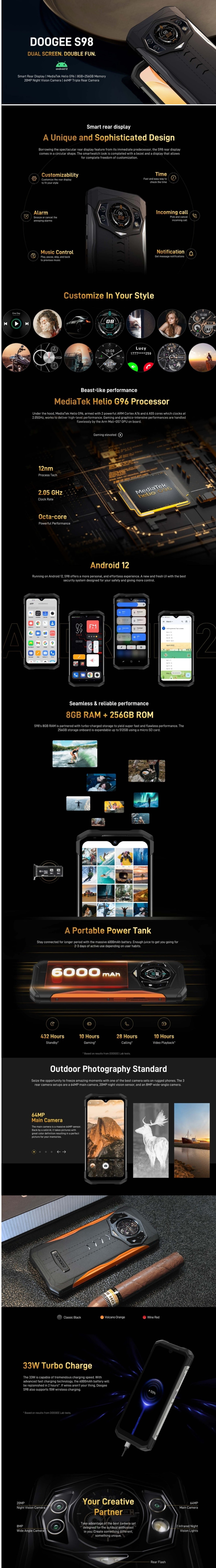 Telefon mobil Doogee S98 Orange, 4G, IPS 6.3", Display secundar, 8GB RAM, 256GB ROM, Android 12, Helio G96, NFC, 6000mAh, Dual SIM