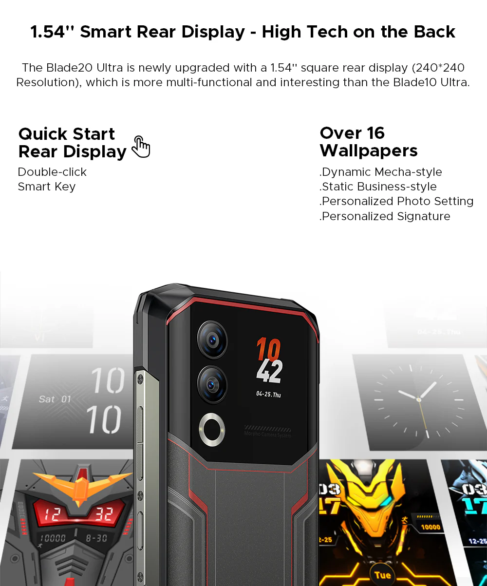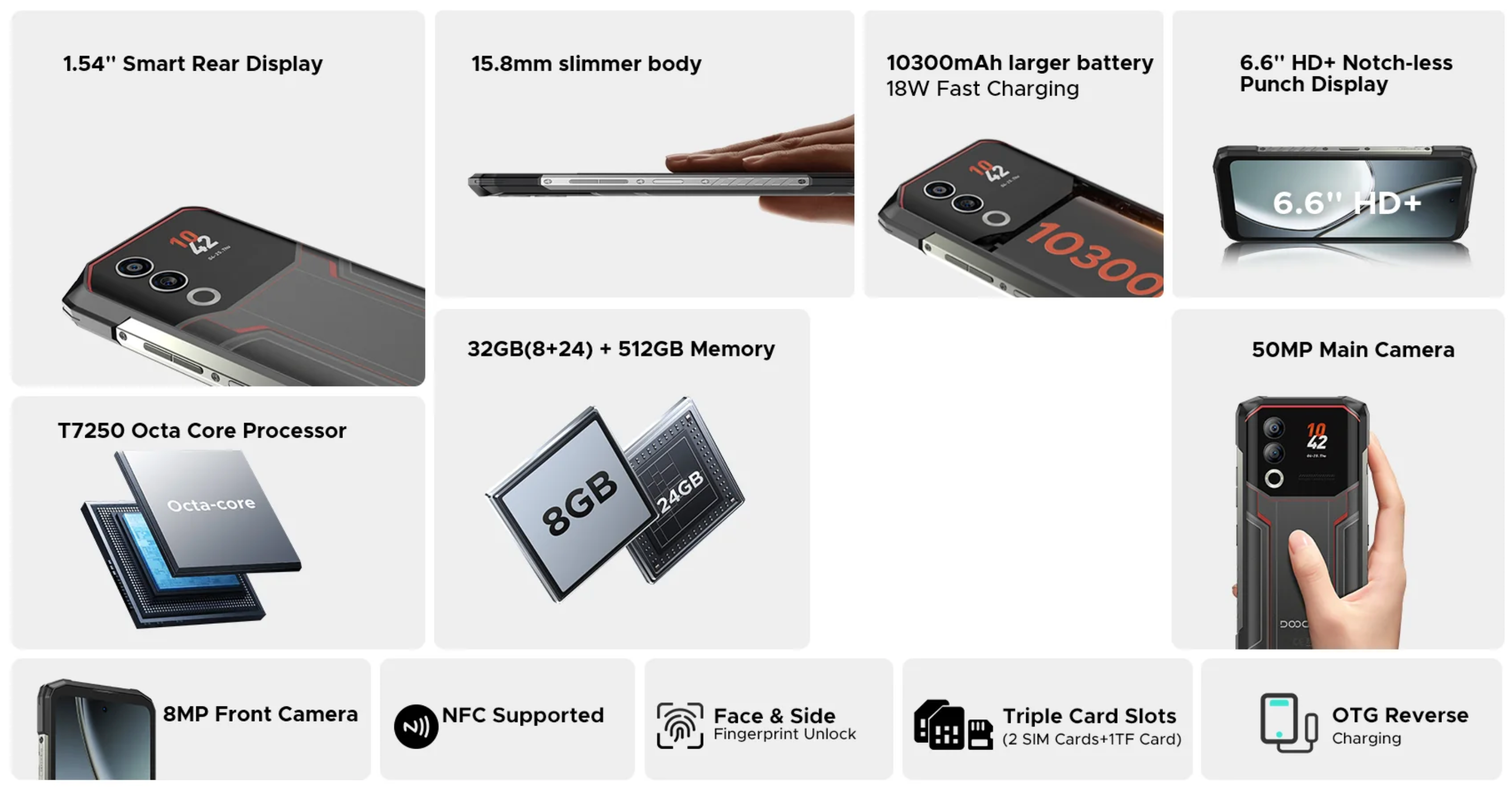 Mobiltelefon Doogee Blade 20 Ultra Piros, 5G, 6.6" HD+ kijelző, 1.54" másodlagos képernyő, 50MP AI kamera, 32GB RAM (8GB+24GB bővíthető), 512GB ROM, Android 14, T7250, 10300mAh, 18W, Dual SIM