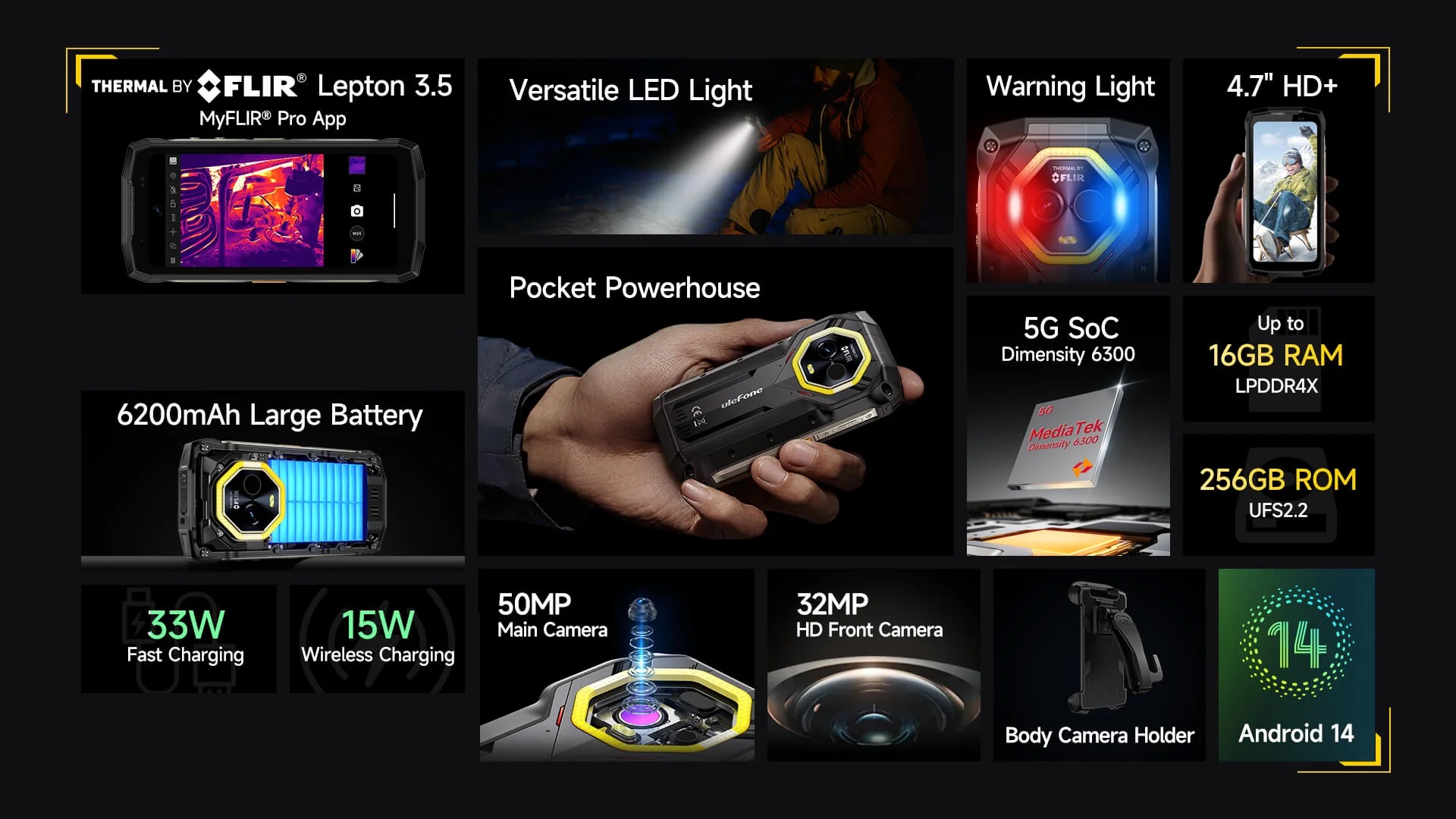 Ulefone Mobiltelefon Ulefone Armor Mini 20T Pro, Fekete, 5G, FLIR Hőkamera, 4,7" FHD+ 90Hz, 16GB RAM (8GB + 8GB bővíthető), 256GB ROM, Android 14, 6200mAh, Dual SIM
