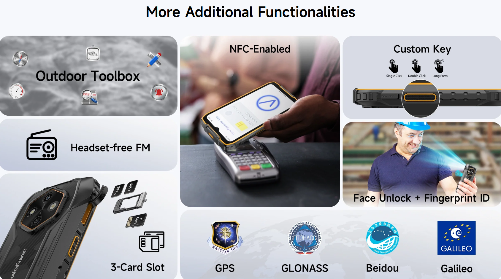 | Egyéb | Értesítési Fény: háromszínű fény, támogatja a töltési jelzést Widevine L1 Eszköztár (Toolbox) FM Rádió Egyedi Gomb (Custom Button) AI Funkciók: Ulefone AI Pro, Gemini AI, ChatGPT, Grok Szuper Fáklya Zseblámpa (Super Torch Flashlight) |