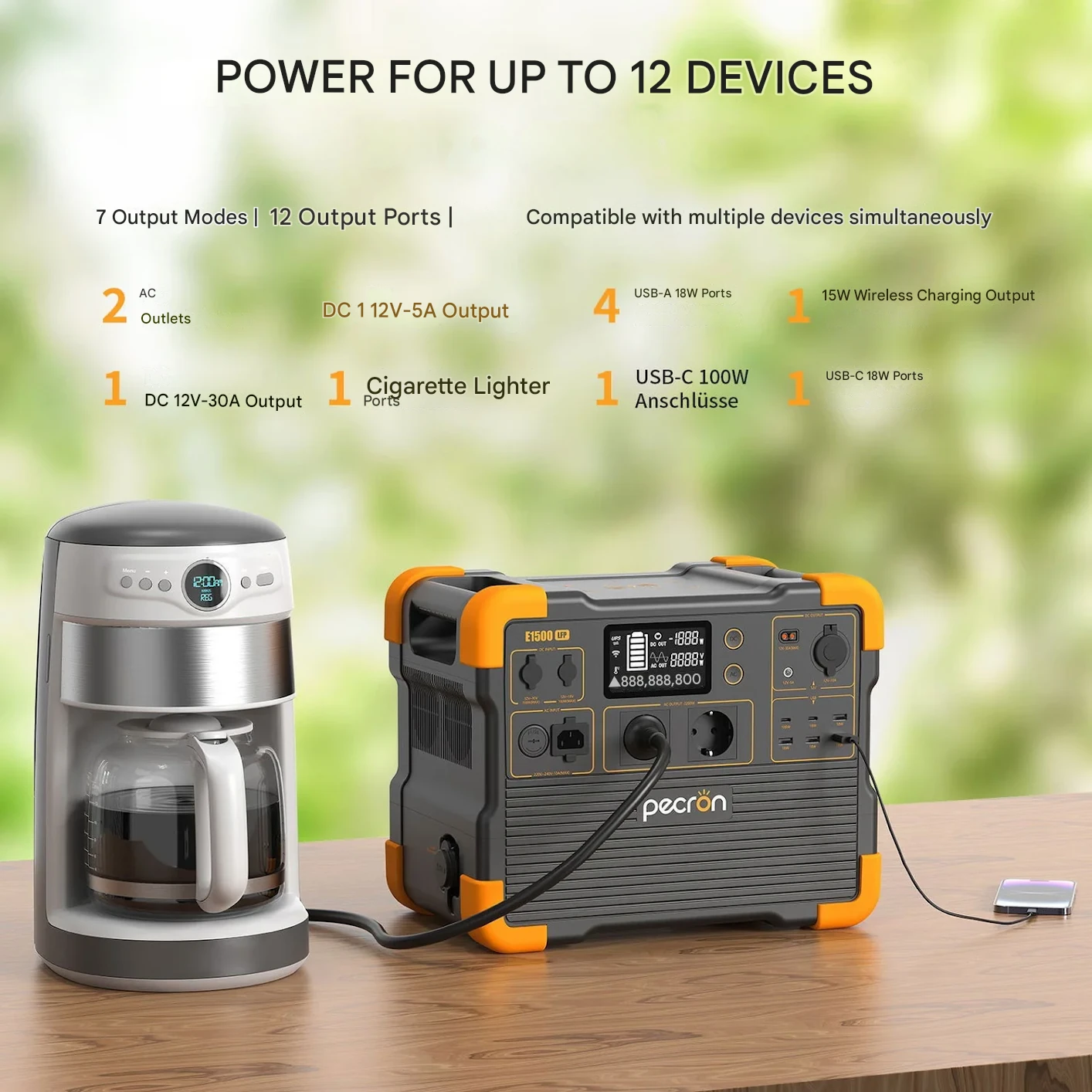 | Kimeneti portok | 2x AC kimenet 1x DC 12V kimenet 1x 12V/30A kimenet 1x Szivargyújtó csatlakozó 4x USB-A 2x USB-C 1x Vezeték nélküli töltés (15W) |