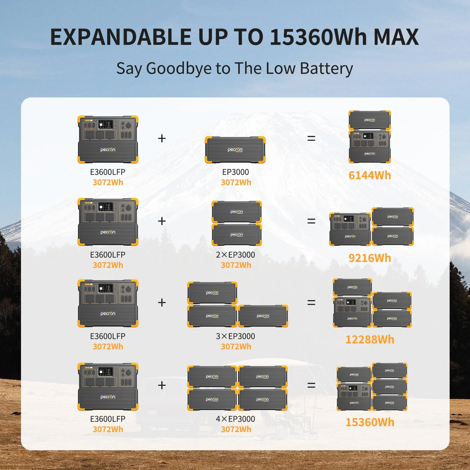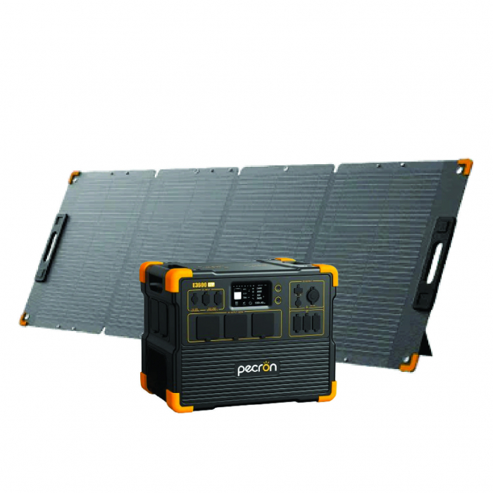 Csomag Hordozható elektromos töltőállomás PECRON E3600LFP, 3072Wh (bővíthető akár 15360Wh-ig), 3600W, 230V, szupergyors töltés, LiFePO4, dupla MPPT, BMS + PECRON PV200 Hordozható Napelemes Panel, 200W