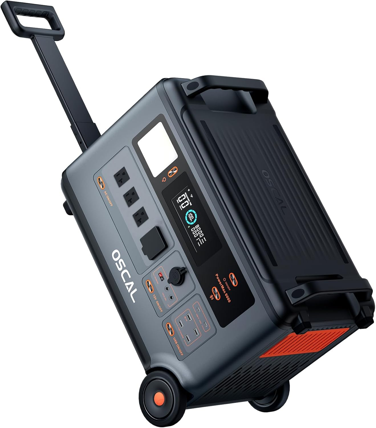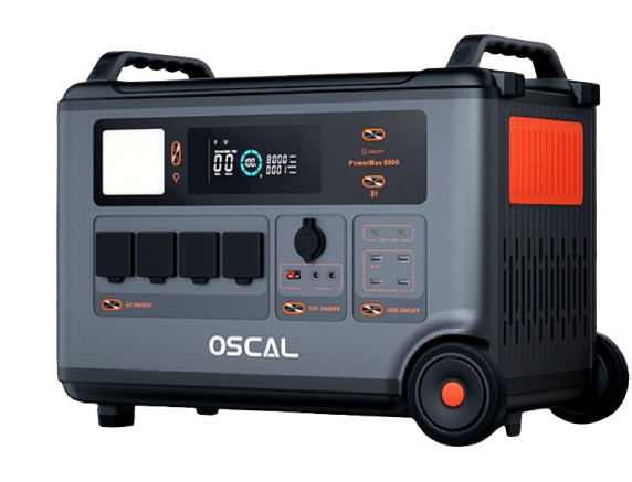 Hordozható energiaállomás OSCAL PowerMax 6000, 6000W (7200W csúcs), 3600Wh LiFePO4 akkumulátor, gyors töltés 1.96 órán belül, 14 port, USB-C 100W, intelligens távoli vezérlés, UPS funkció