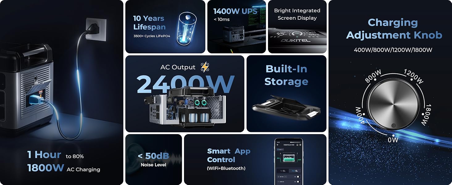 Oukitel P2001E Plus hordozható elektromos töltőállomás / külső akkumulátor, 2048Wh, 2400W, 220V, LCD kijelző, 13 kimenet, BMS védelem