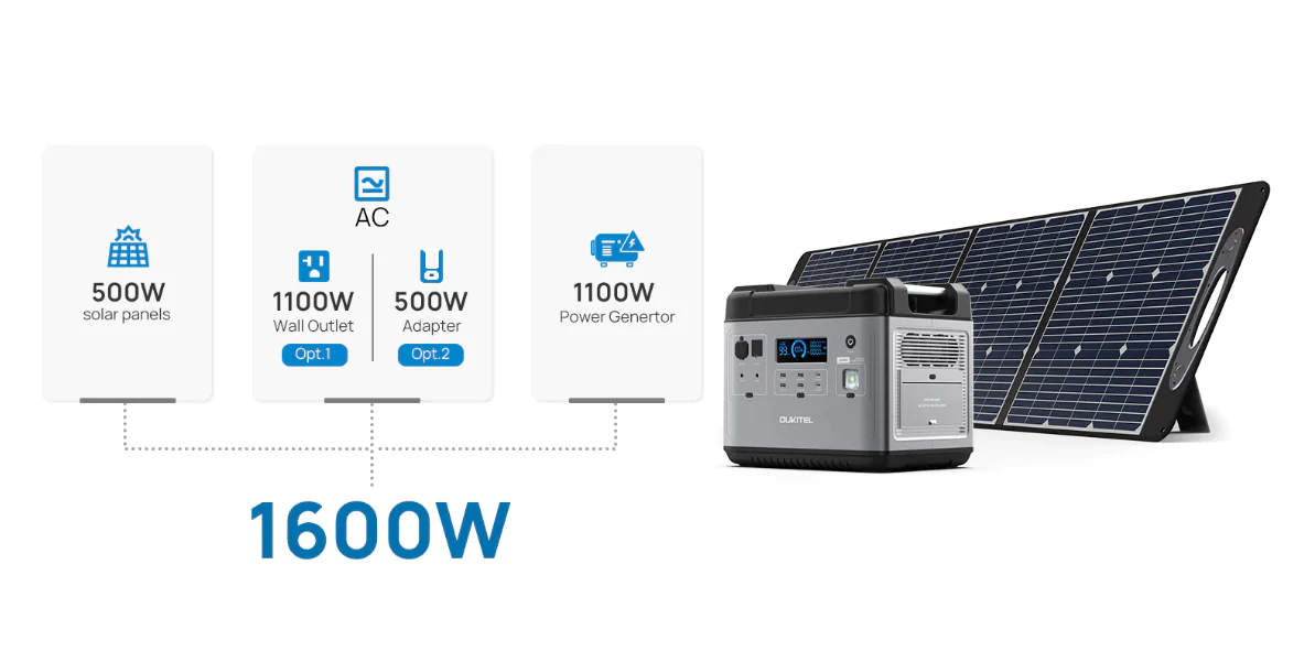 Continut pachet: Cablu alimentare priza, Cablu pentru incarcare solara, Incarcator masina, Statie de incarcare portabila Oukitel P21001E, Manual de utilizare
